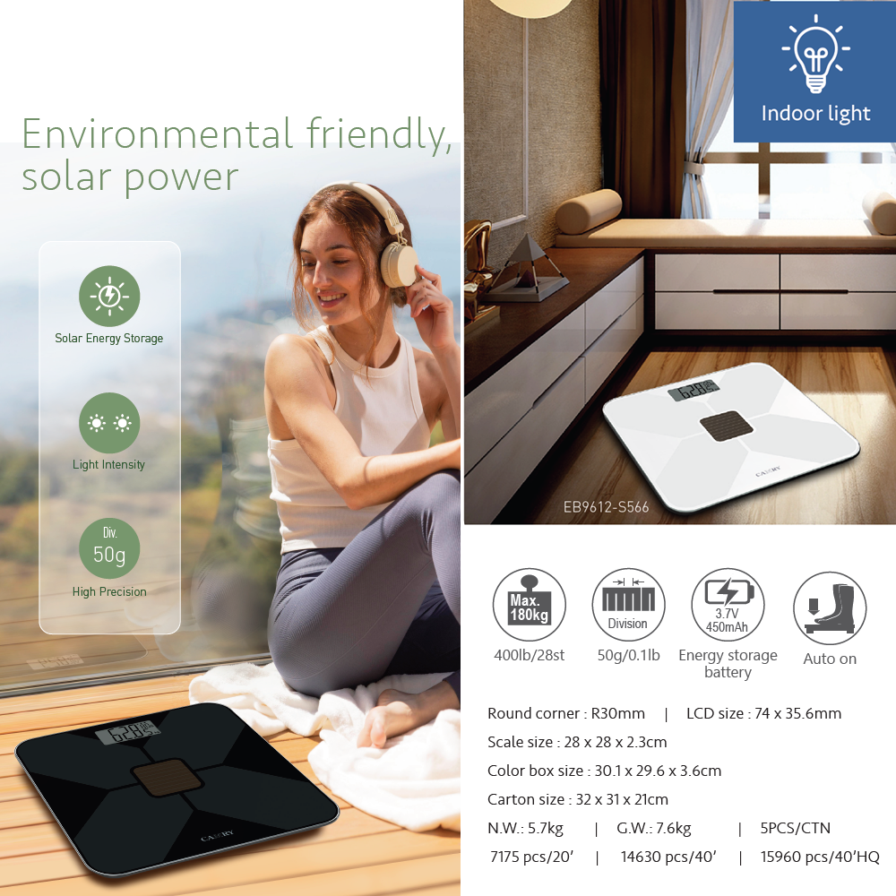 Simply place your scale in sunlight or indoor light to start automatic charging. Auto calibration, high precision sensors measure in increments of 0.2 lb, 0.05 kg with 400 lbs, 180 kg capacity.