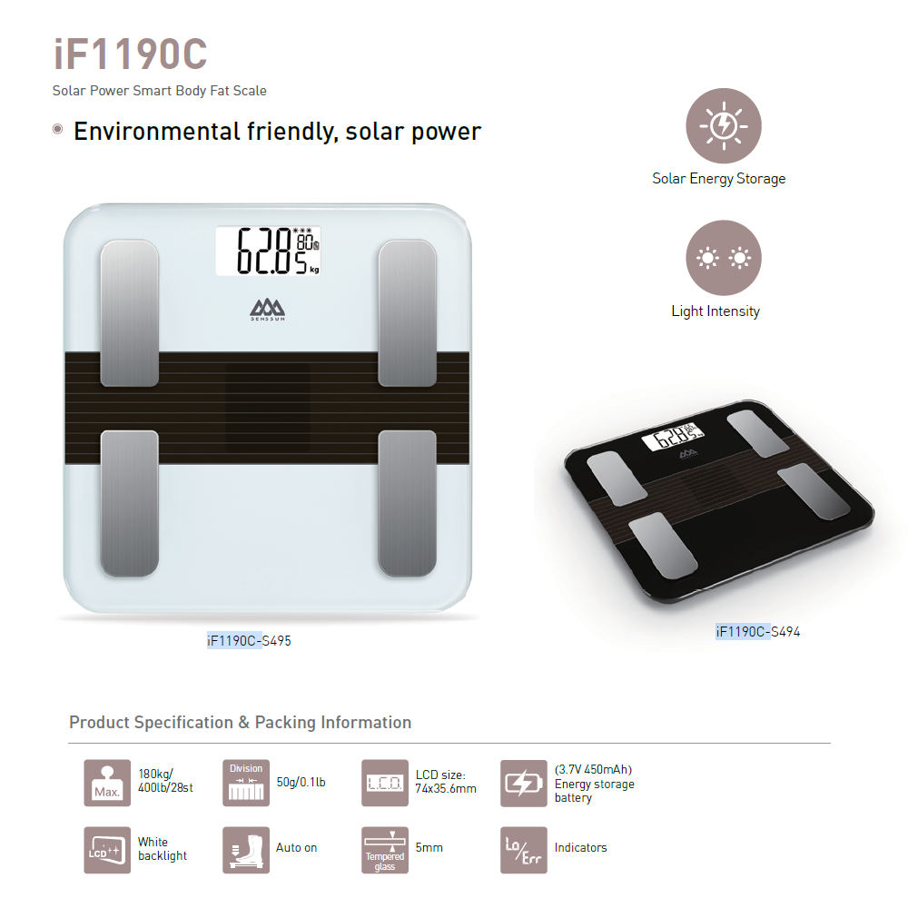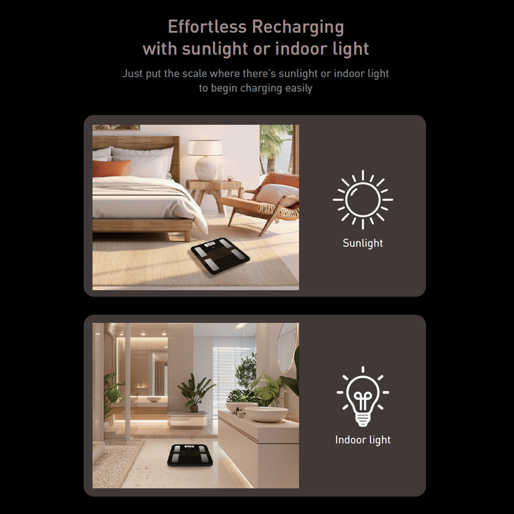 Simply place the scale in a spot with sunlight or indoor lighting, and it begins charging automatically. No cables, no hassle—just effortless power that keeps your health tracking seamless and always ready.
