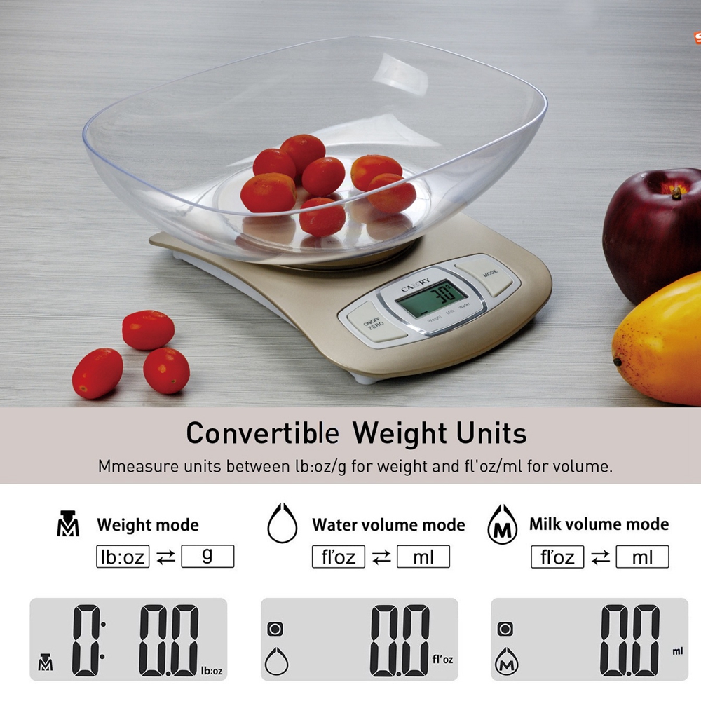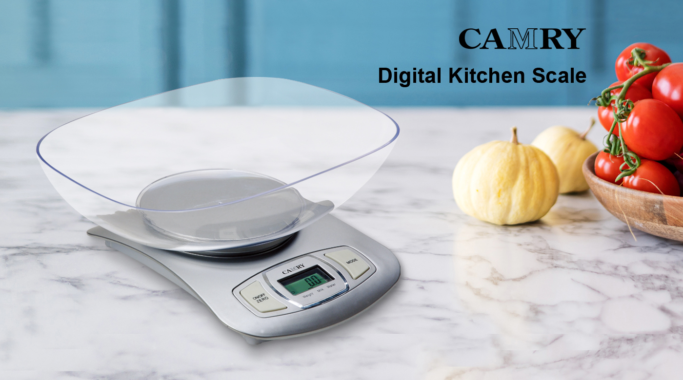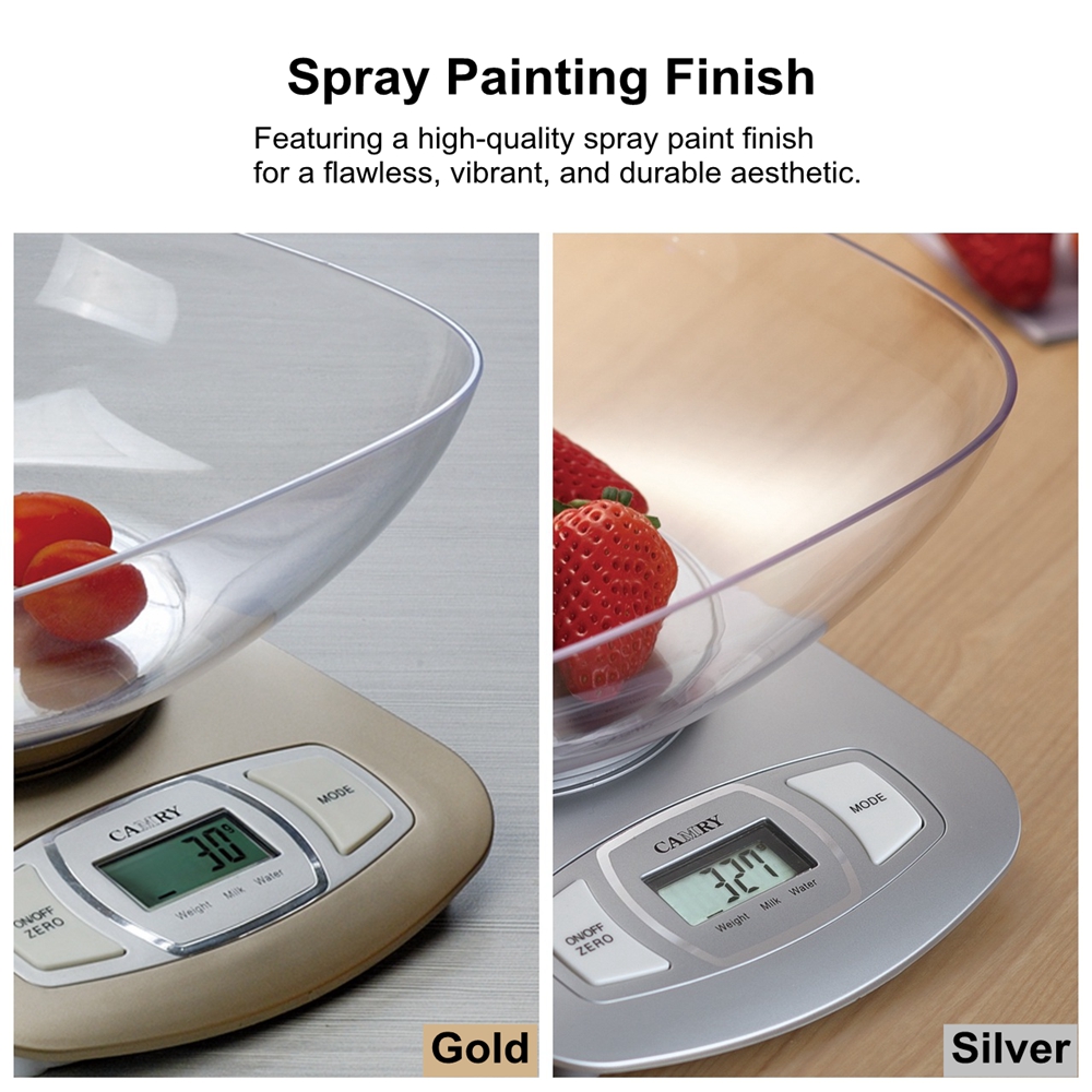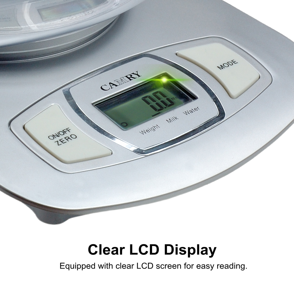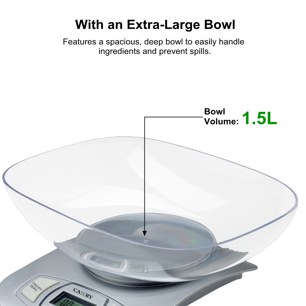 【Digital Food Weight Scale with 1.5L Measuring Bowl】This Camry Food Weight Scale is made of high-quality food grade ABS plastic, it weighs in grams and ounces. This diet food scale give your accurate measurement of all kind of food, meat, vegetables, fruit. The fashion and unique design without touchless button, suitable for cooking, baking and healthy diet management.