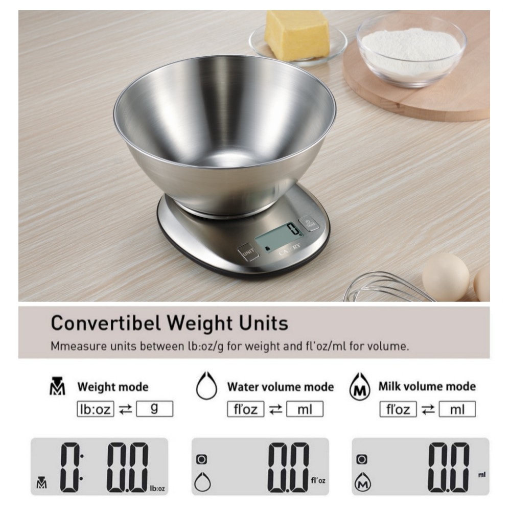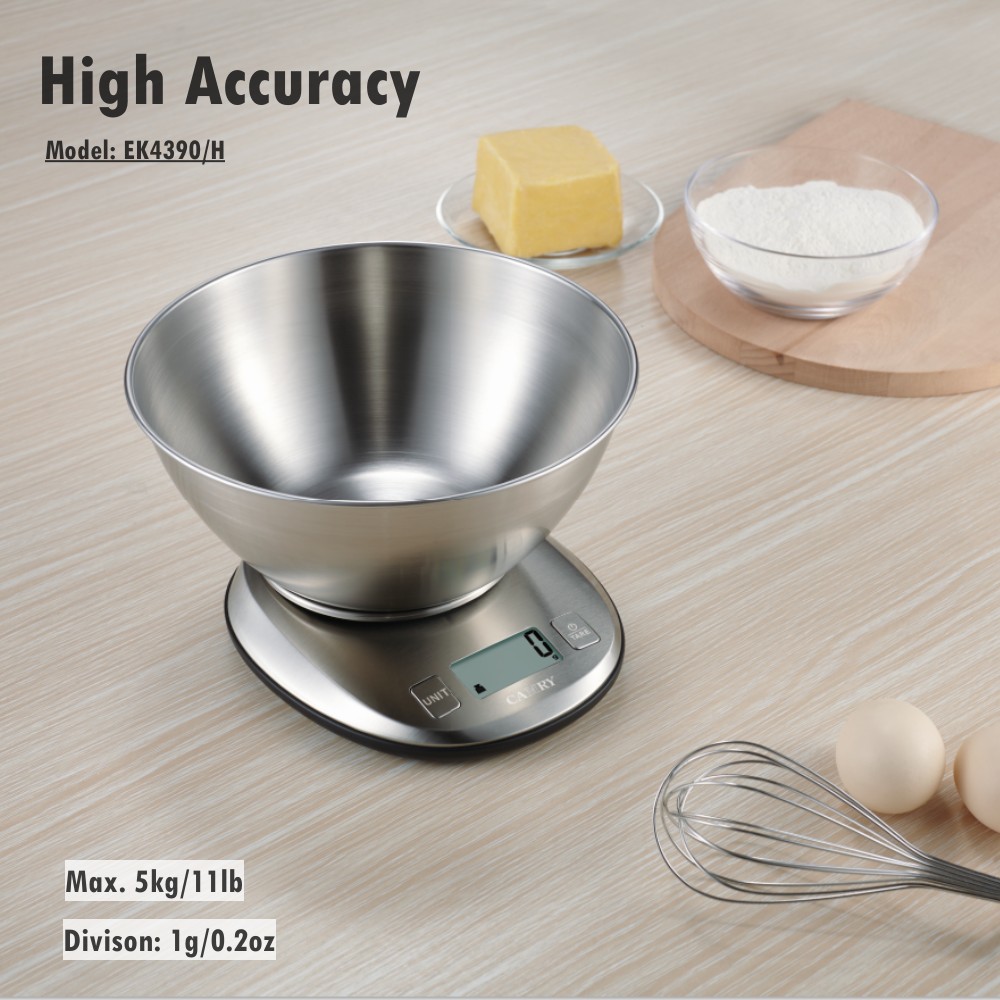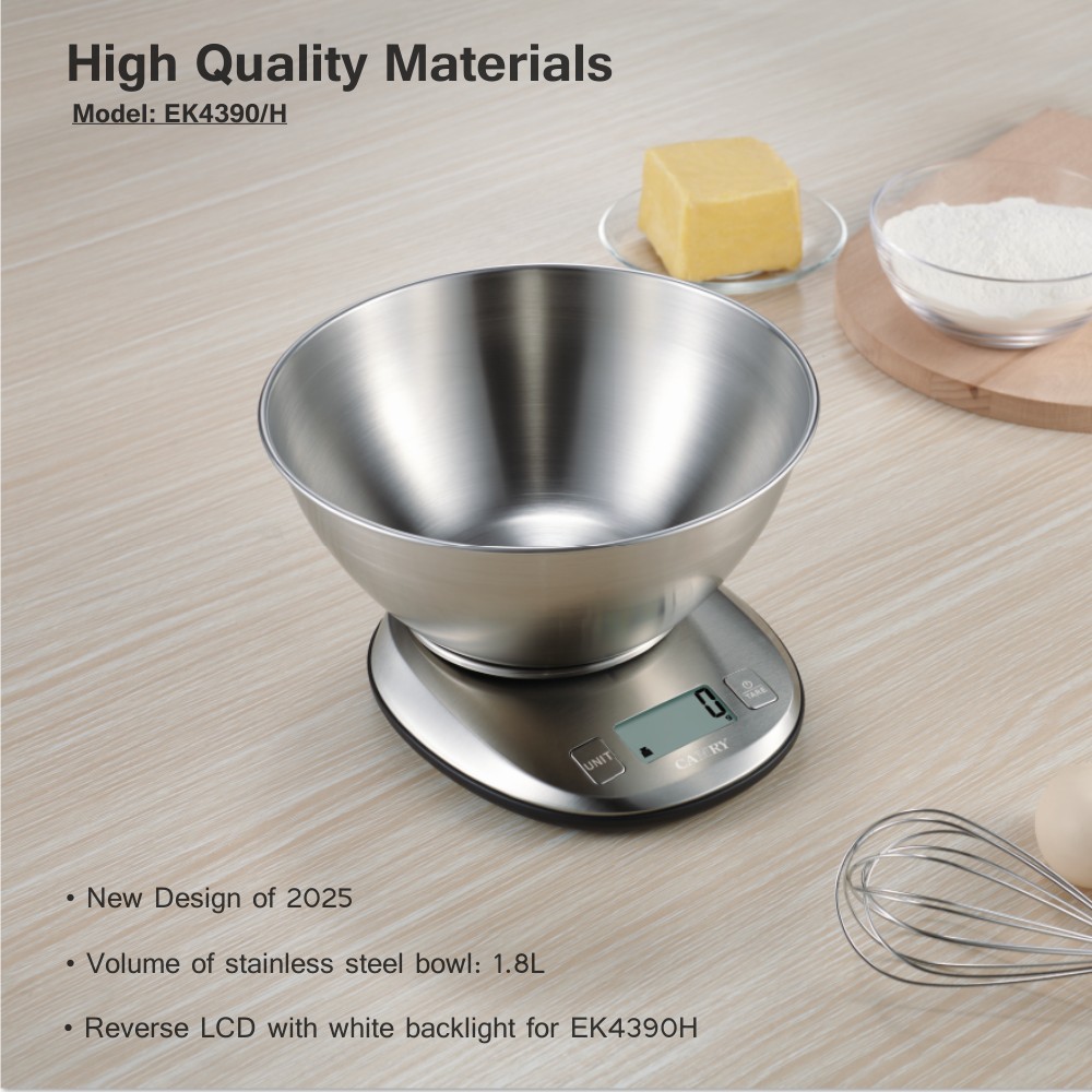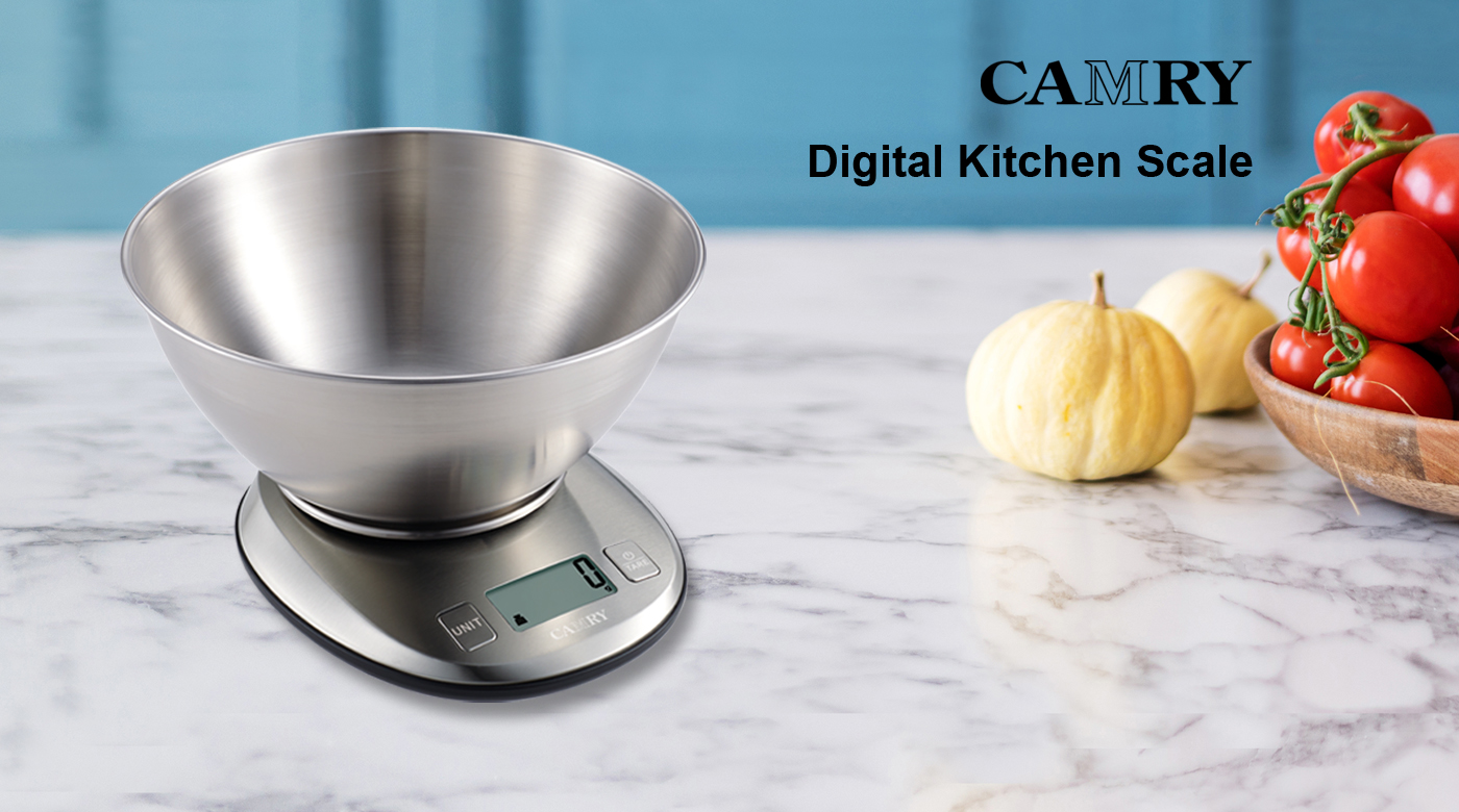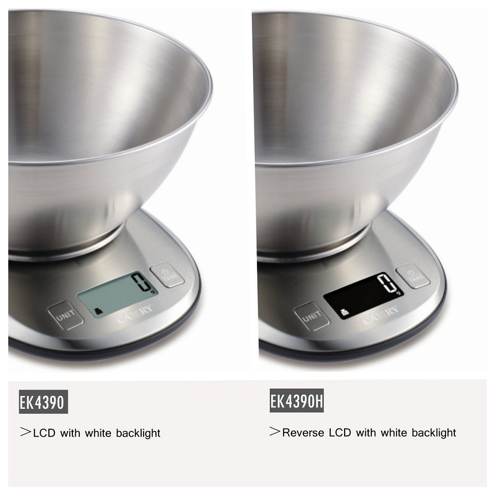 【Premium Digital Stainless Steel Food Weight Scale with 1.8L Measuring Bowl】This Camry Food Weight Scale is made of high-quality stainless steel, shows large clear readings with large LCD Display. Two LCD Display visions are available, with reverse LCD white backlight for EK4390H. This diet food scale give your accurate measurement of all kind of food, meat, vegetables, fruit. The fashion and unique design with touch buttons, suitable for cooking, baking and healthy diet management.
