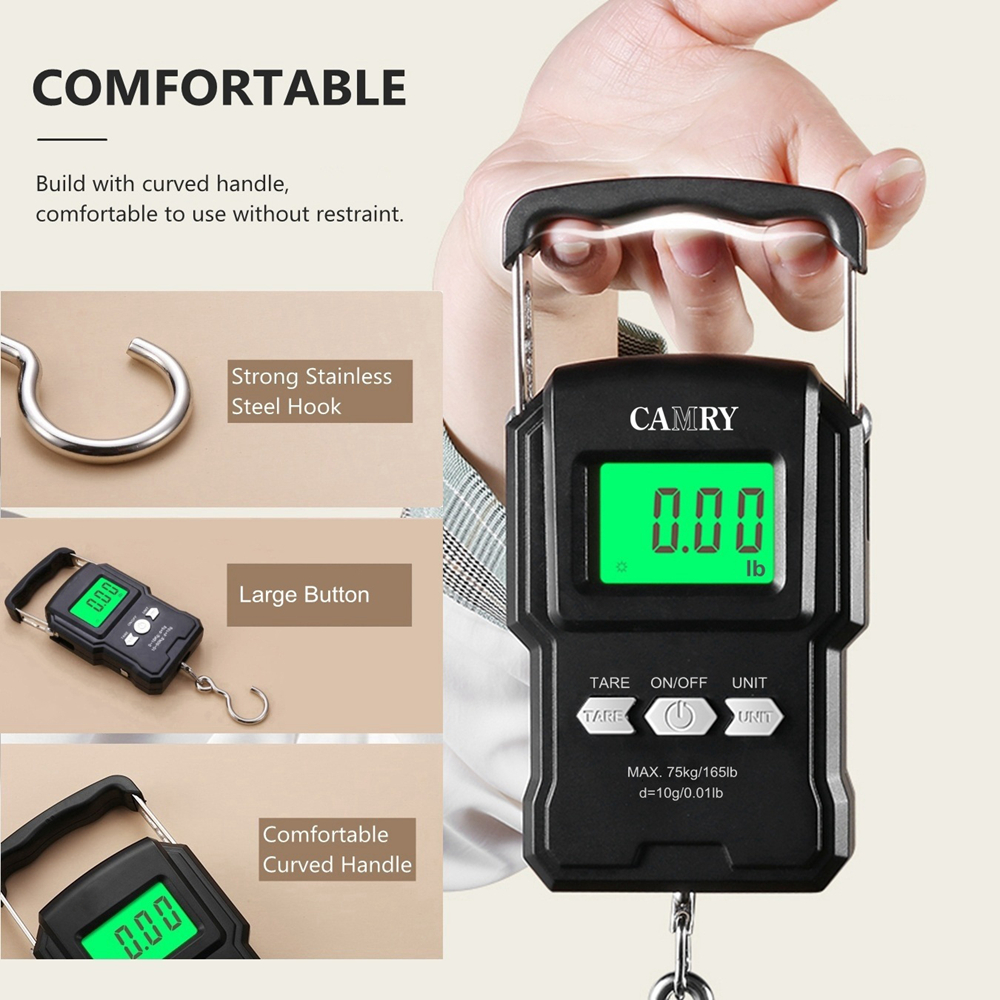 Featuring an ergonomic curved handle designed for fatigue-free operation.Built with a strong stainless steel hook and large buttons for easy operation,this professional scale offers 75kg/165lb capacity with 10g/0.01lb precision.Includes TARE,ON/OFF and UNIT functions.