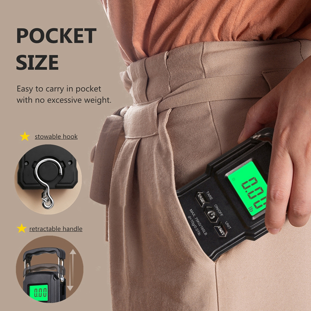 【Hanging Weighing Scale】Combines precision weighing with integrated 1m tape measure functionality.Designed for professional use in logistics,fishing,agriculture and industry,this robust scale delivers 75kg/165lb capacity with 100g/0.01lb accuracy.The green backlit LCD ensures clear visibility in all lighting conditions.Compact and portable (11.5*7.2*3.0cm),it features a built-in 39" measuring tape for simultaneous weighing and measuring applications.Perfect for weighing luggage,cargo,fishing catch,and industrial items.