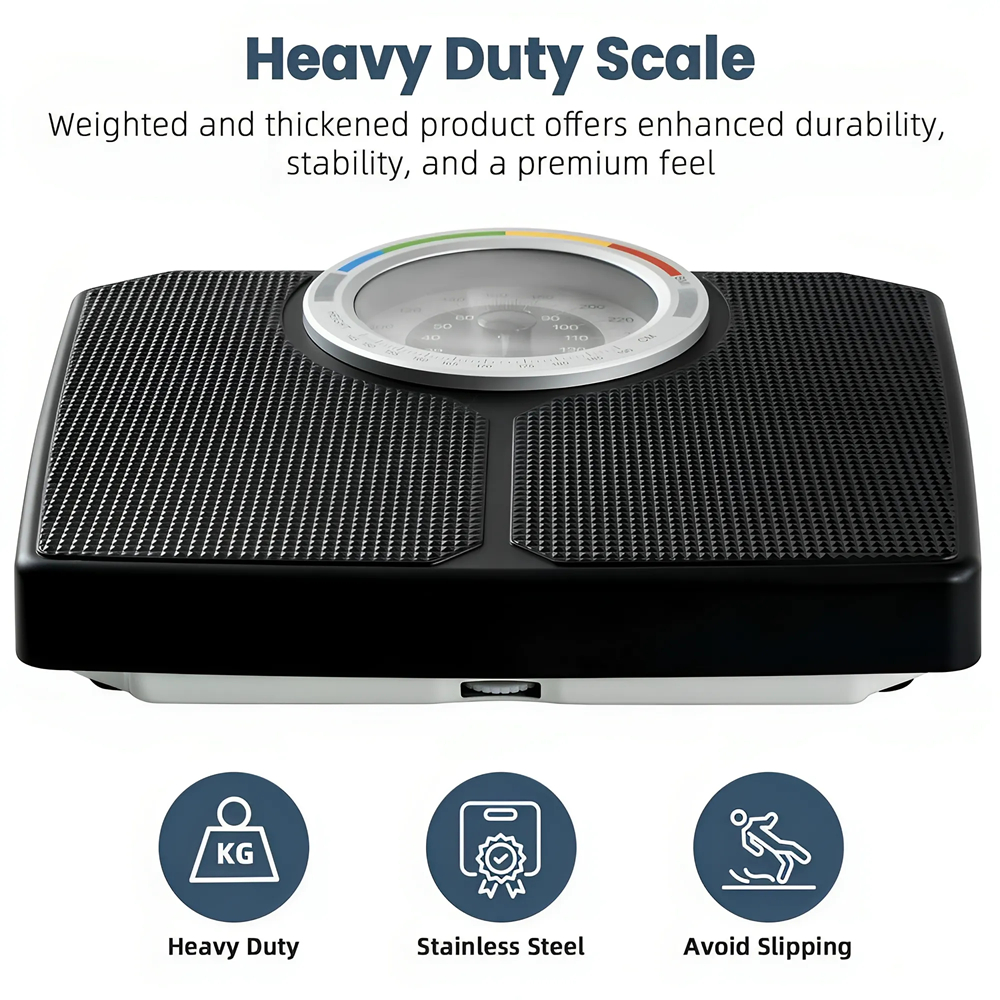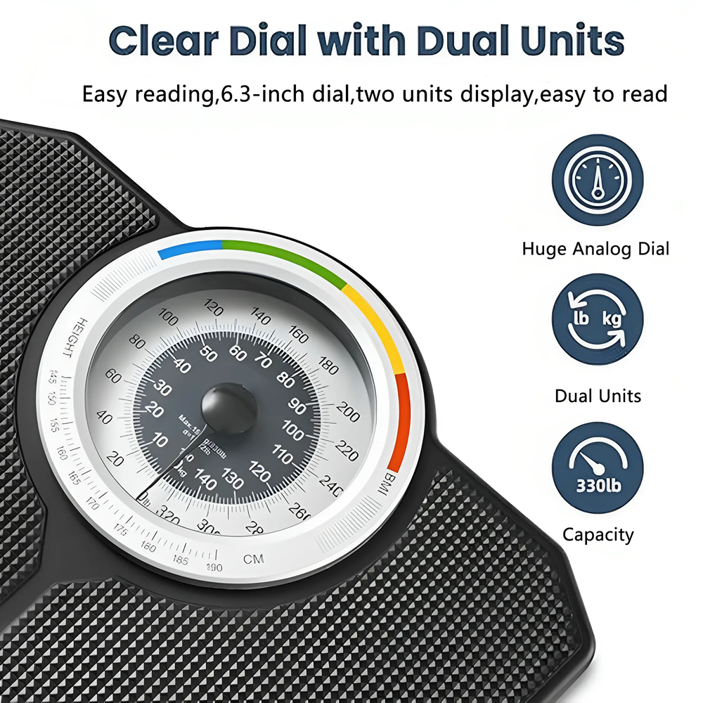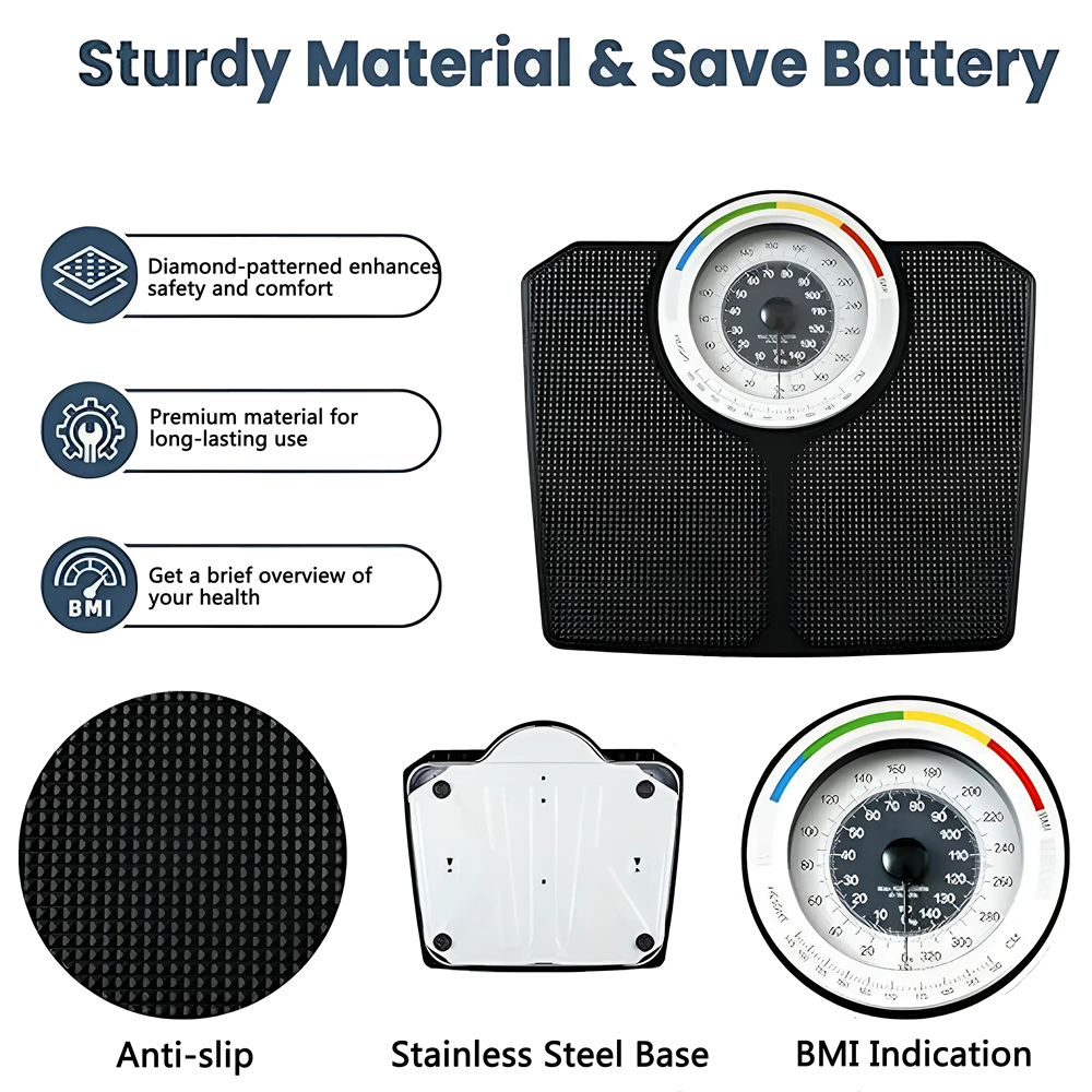 【Mechanical Bathroom Scale】Feature an anti-slip plastic platform and e*tra large 150kg/330lb capacity with 1000g/2lb precision.The oversized display shows weight clearly while providing BMI indication for health monitoring.With its sturdy construction and large measuring surface (35.9*32.1cm),this scale is perfect for household use and health-conscious families.