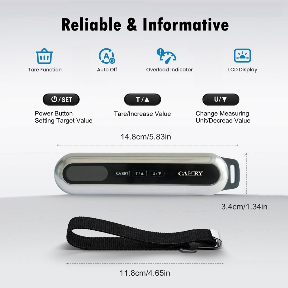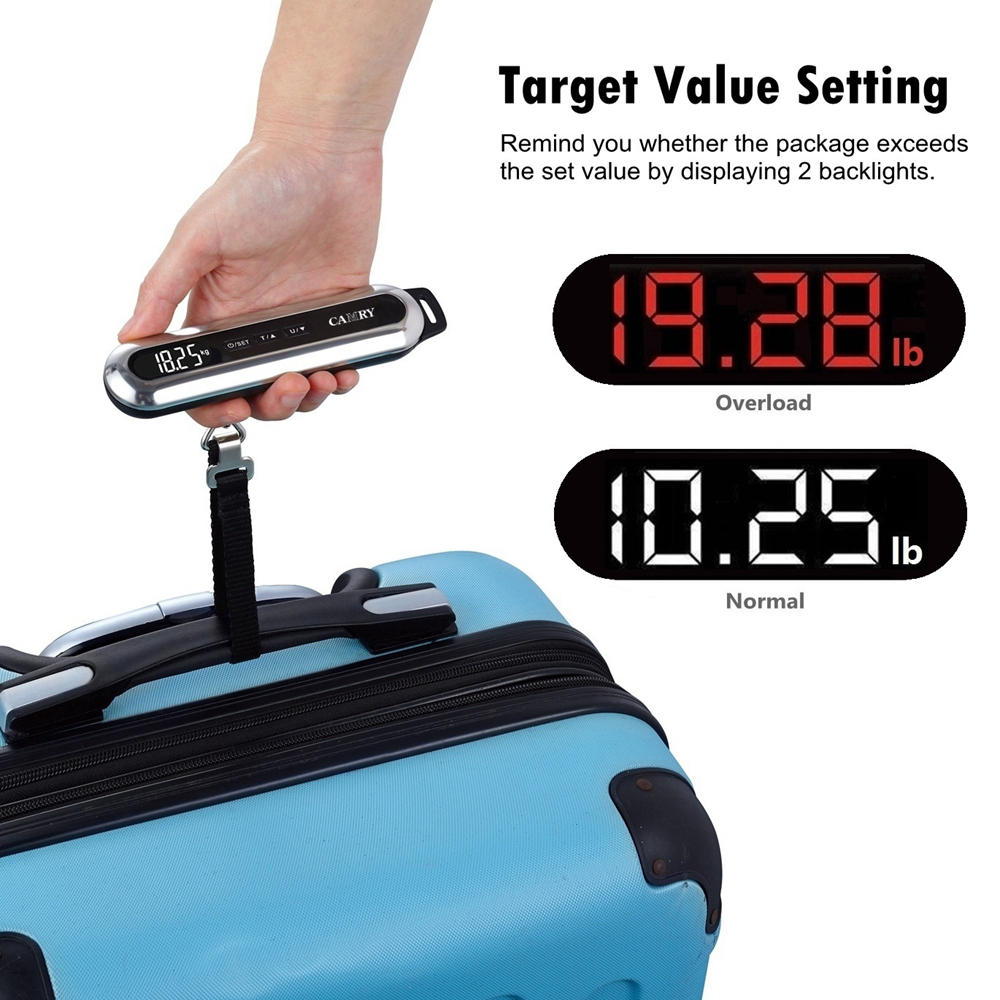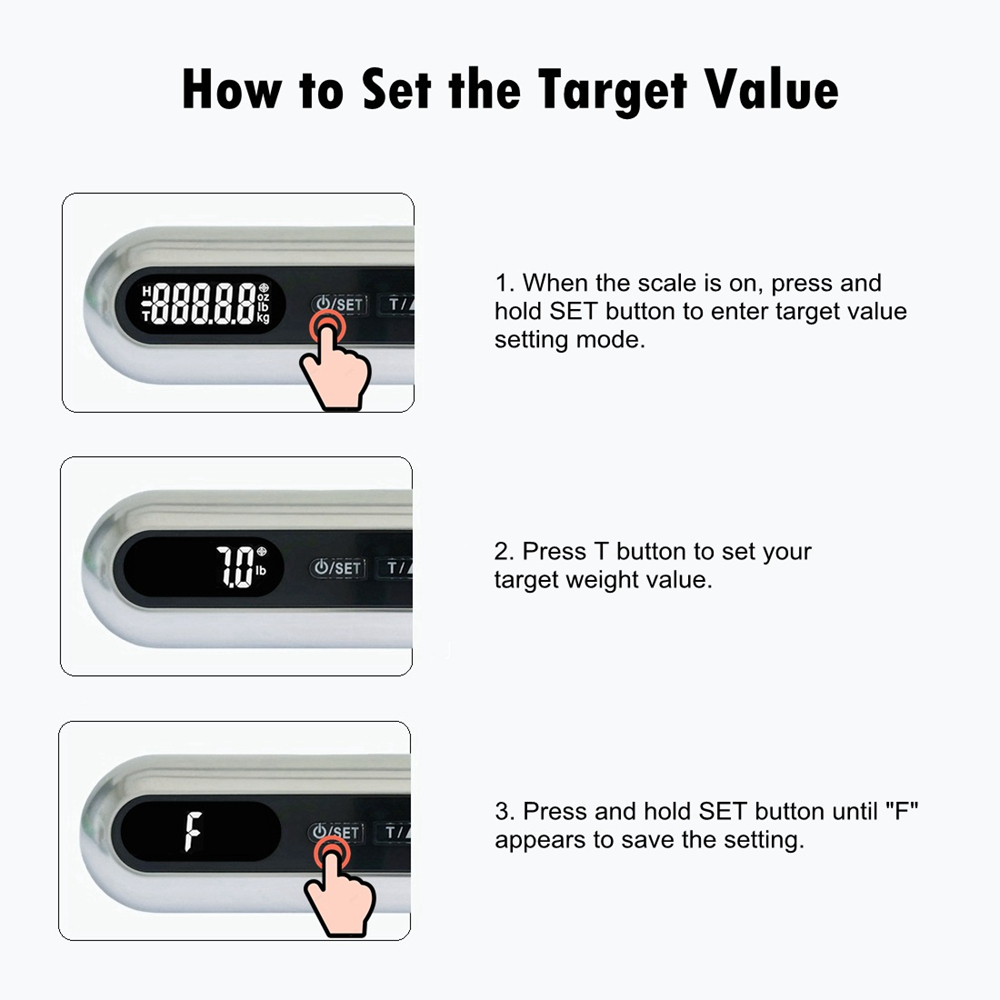 Set target weights effortlessly with the CAMRY EL970H's intuitive 3-step process: 1) Hold SET to enter mode,2) Press T button to adjust value,3) Hold SET to save.This smart function triggers red backlight alerts when weights exceed limits,ensuring perfect control for luggage,packages,and travel needs.