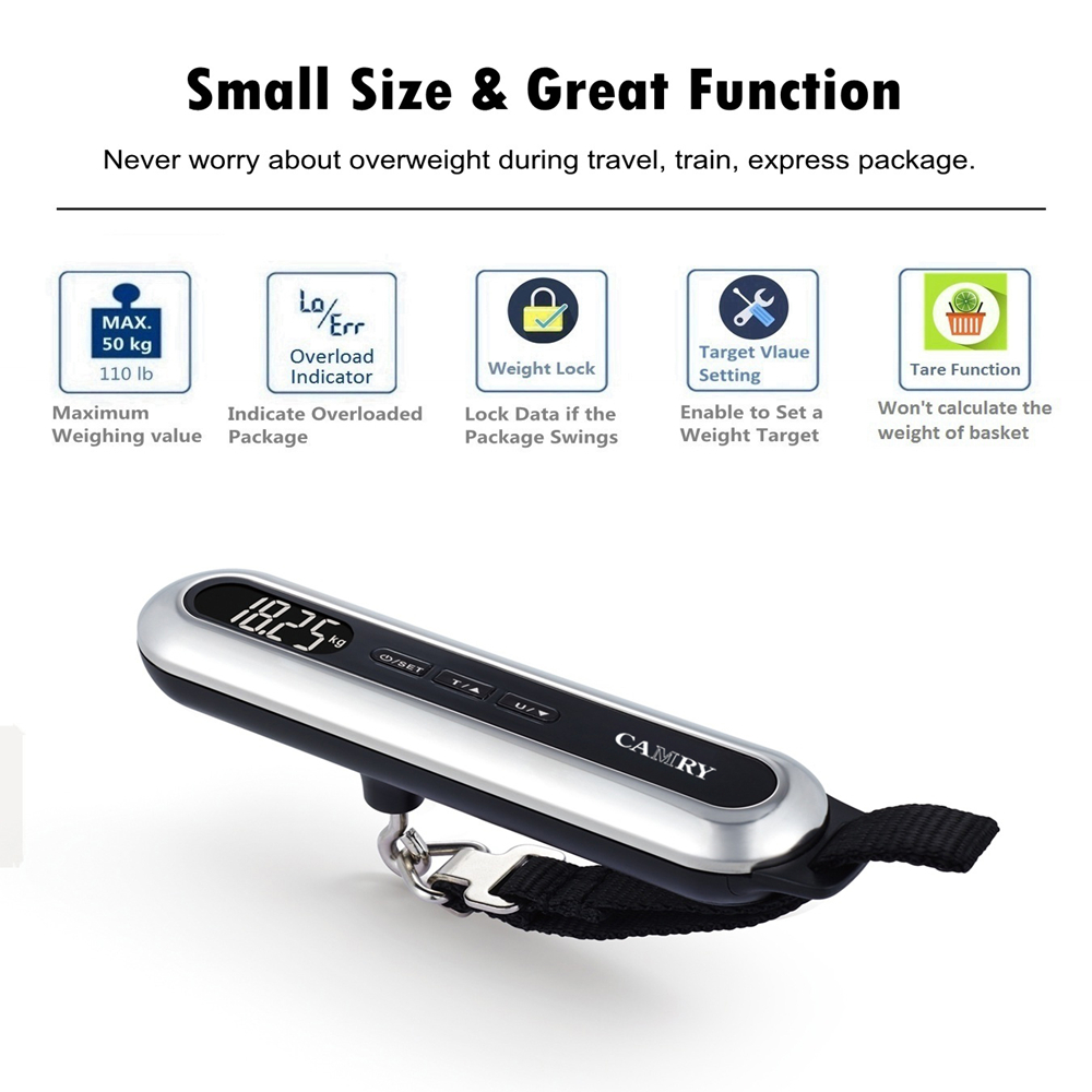 Prevents travel overweight worries with smart overload indicator and 50kg/110lb capacity.Features weight lock function for swinging packages,target value setting,and tare function.Perfect for luggage,e*press packages,and travel needs.Compact size with ma*imum functionality including data locking and basket weight e*clusion.