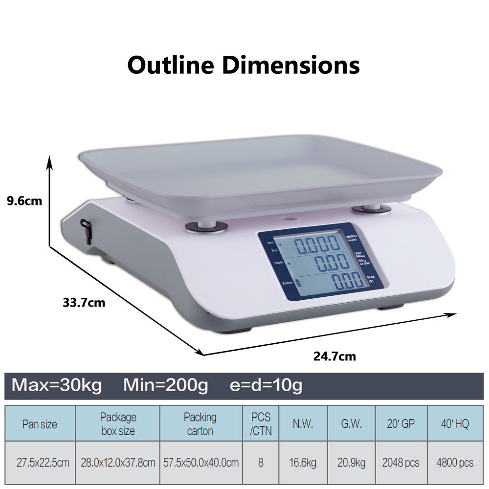 30kg max,compact 33.7x24.7x9.6cm,10g resolution,ideal for commercial weighing with efficient packaging.