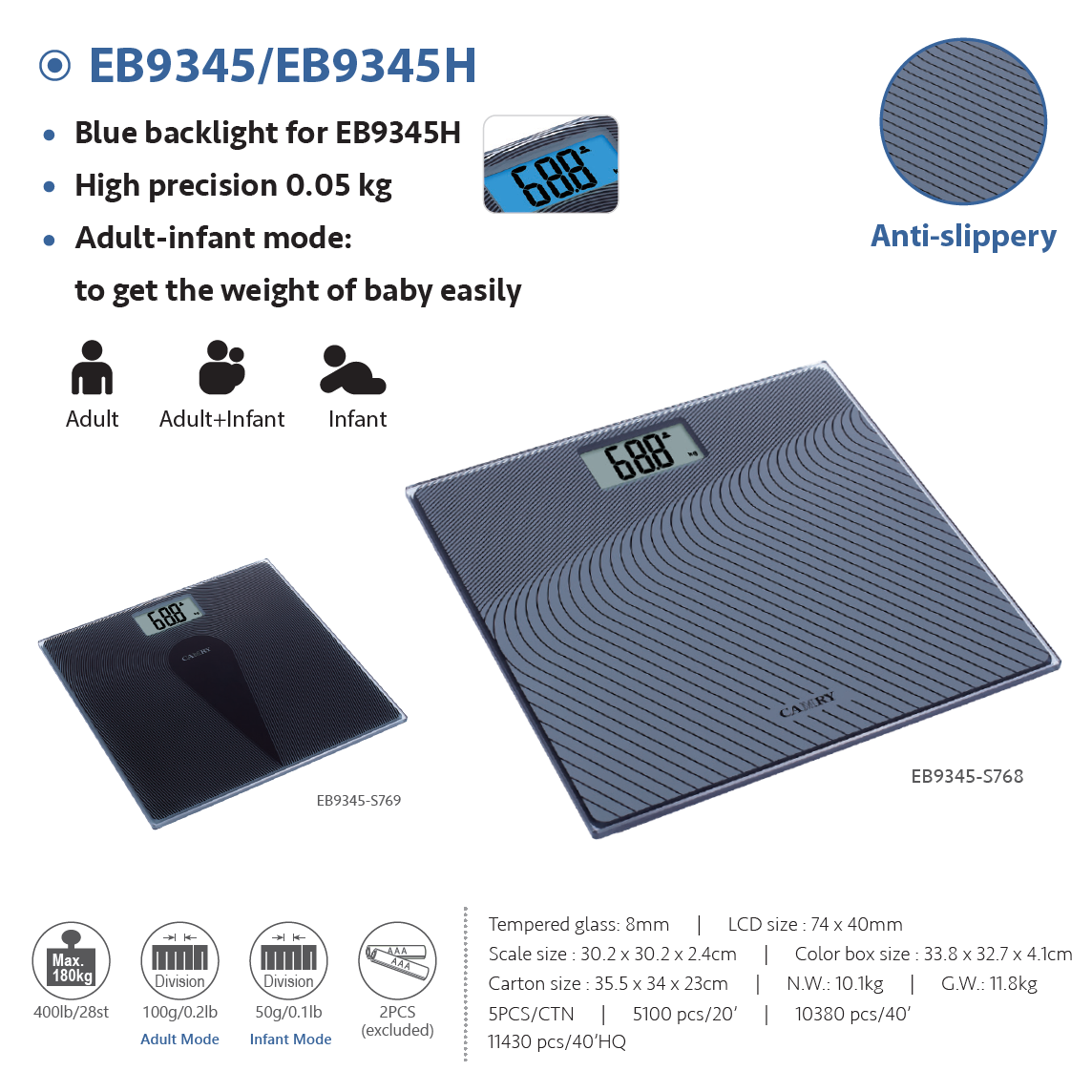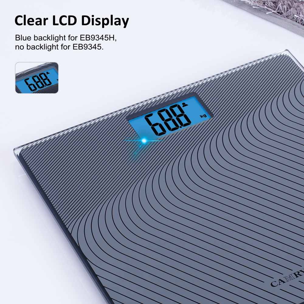 This weight scale has a large LCD display, large numbers make sure you can read the measurement clearly and easily. The one with LCD blue backlight is EB9345H. The one with no backlight is EB9345.