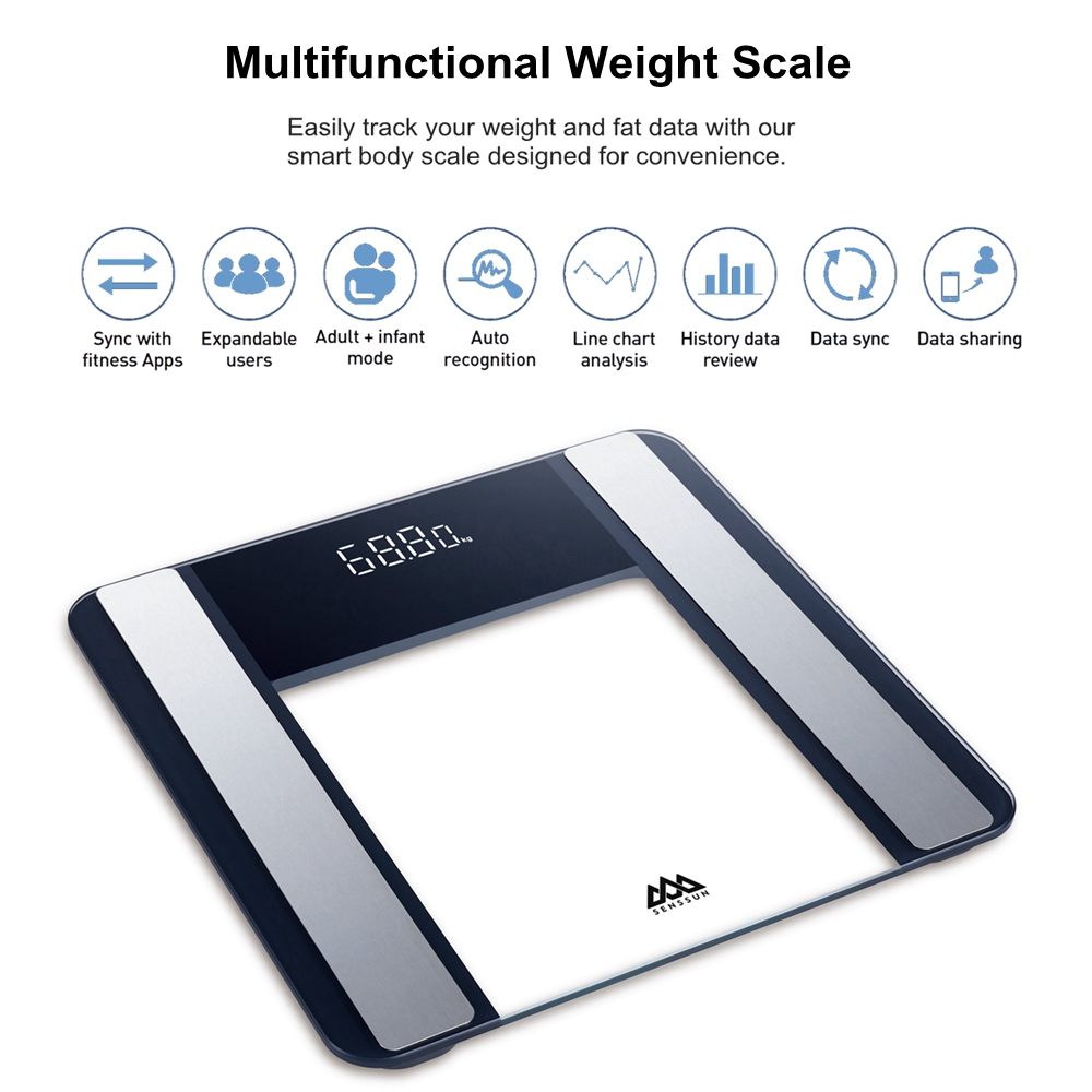 Senssun Smart Scale can measure your weight, body fat percentage, BMI, muscle mass, and other body composition metrics and sends them wirelessly to the free iMoni app. You can see that you are losing weight or gaining muscle over time.