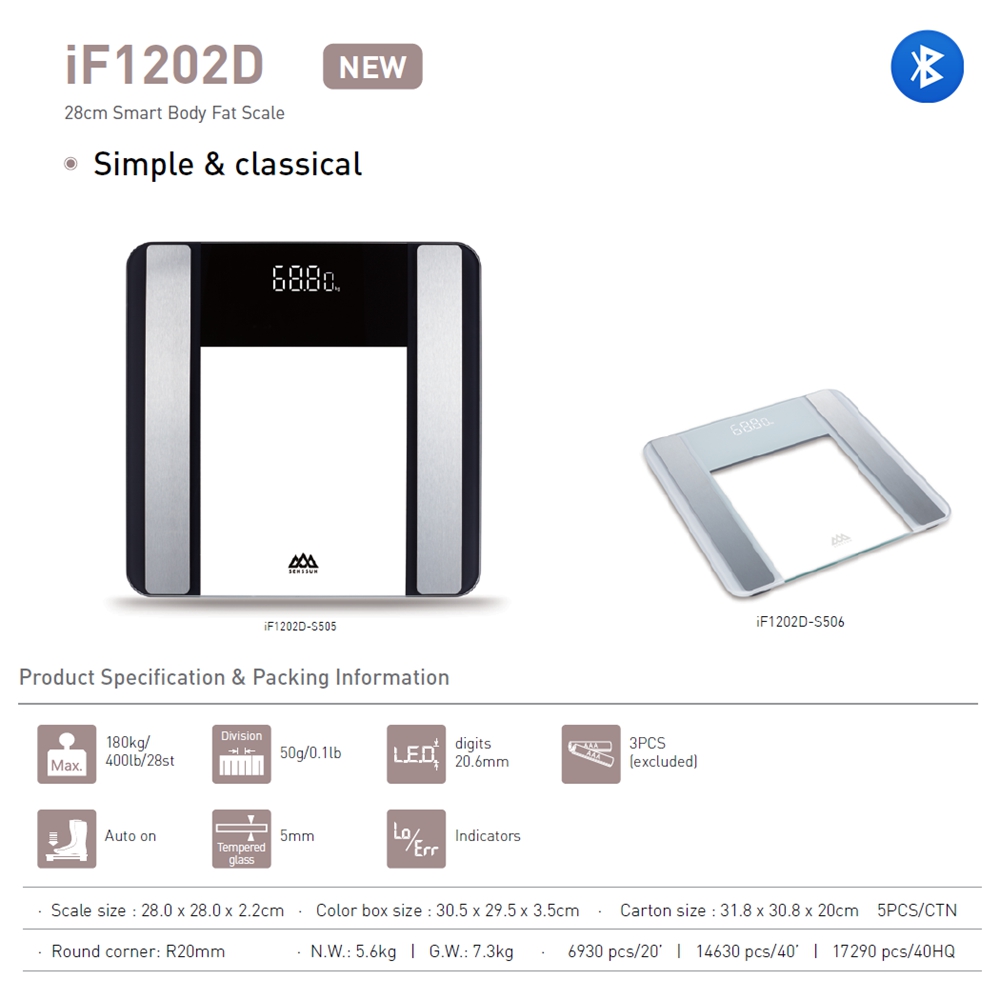 Auto calibration, high precision sensors measure in increments of 0.1 lb, 0.05 kg with 400 lbs, 180 kg capacity. 4 high sensitive electrodes.