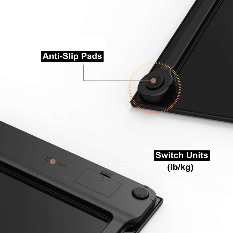 Features auto calibration, auto on/off, low battery indicator, overload indicator. High precision sensors measure in increments of 0.2lb/0.1kg with 400lbs/180kg capacity.