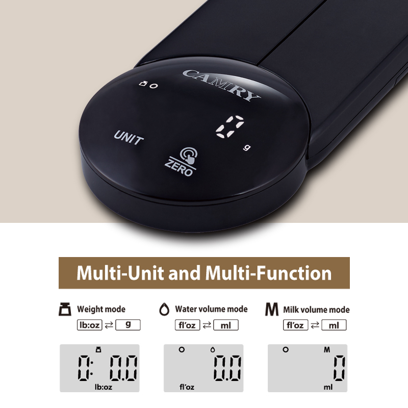 Provides with an easy control buttons to simply convert weight and volume units (lb:oz,fl'oz, g, ml). Delivers accurate results and effectively measure in grams, ounces, pounds. Water/milk mode will help you measure liquid's volume directly.