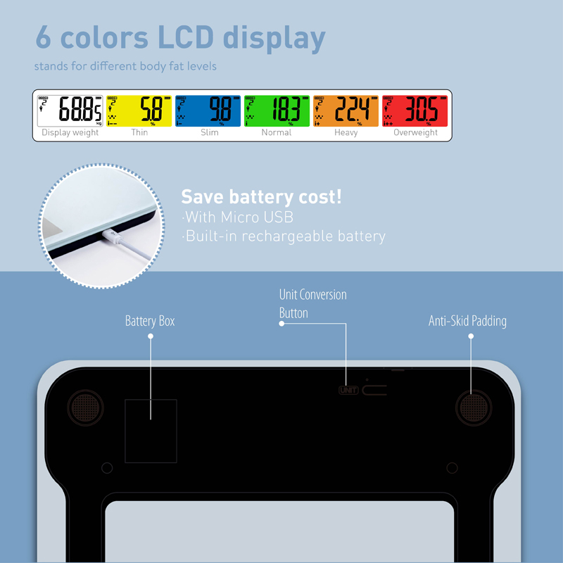 6 colors LCD display show different body fat levels. Save battery cost!With Micro USB.Built-in rechargeable battery