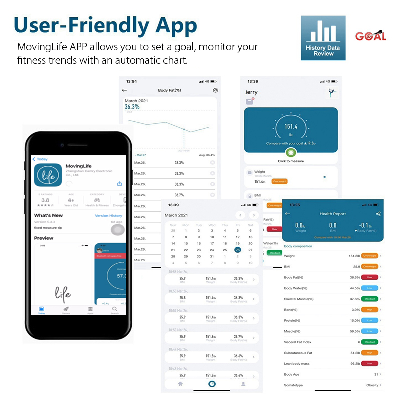 MovingLife APP allows you to set a goal, monitor your fitness trends with an automatic chart, track your historical data.