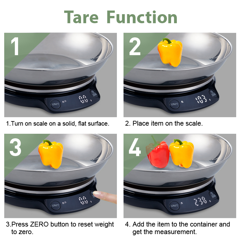 The scale comes with a tare function that allows you to zero out a weight/volume when using a bowl/bottle as a container or working with multiple ingredients by simply pressing the "Zero" button.