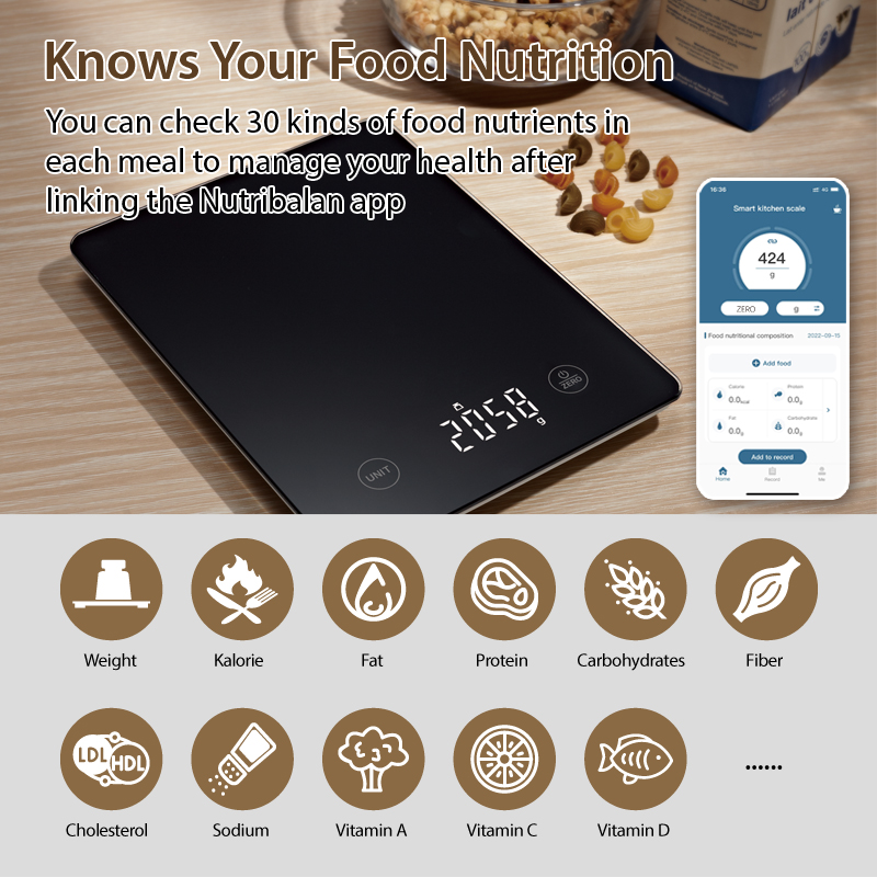 The extensive food database in Nutribalan APP contains 30 nutritional analysis for each meal, such as calories, protein, fat, carbohydrates etc. The smart nutritional scale allows you to manage the nutrition and calories of food, helping you enjoy healthy life.