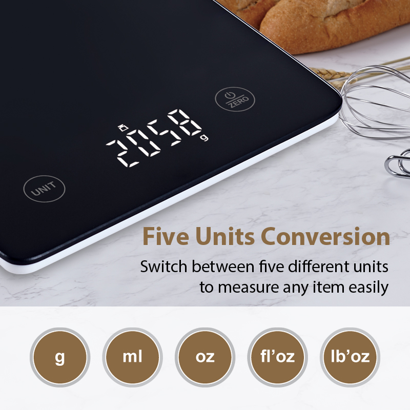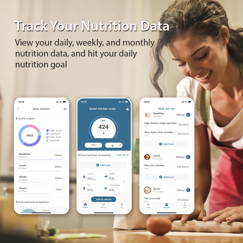 The nutritional scale equipped with four high-precision sensors that weigh from 1g(0.05oz) and it has extra large capacity to 10kg(22lb), which can meet any needs while cooking, baking or meal prep and ensure your creation is perfect according to the recipe.