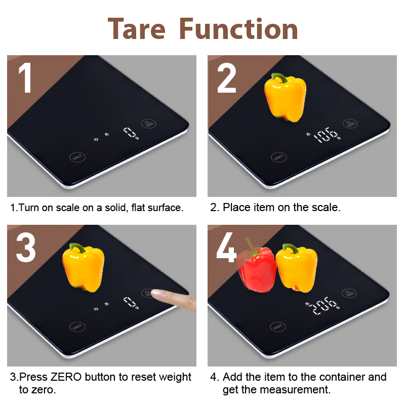 The scale comes with a tare function that allows you to zero out a weight/volume when using a bowl/bottle as a container or working with multiple ingredients by simply pressing the "Zero" button.