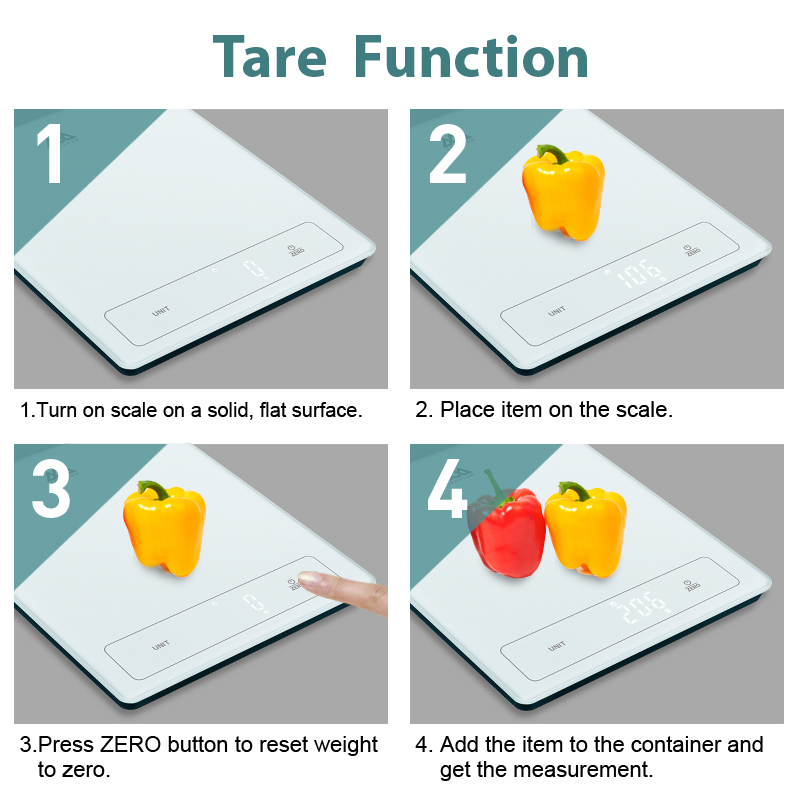 The scale comes with a tare function that allows you to zero out a weight/volume when using a bowl/bottle as a container or working with multiple ingredients by simply pressing the "Zero" button.
