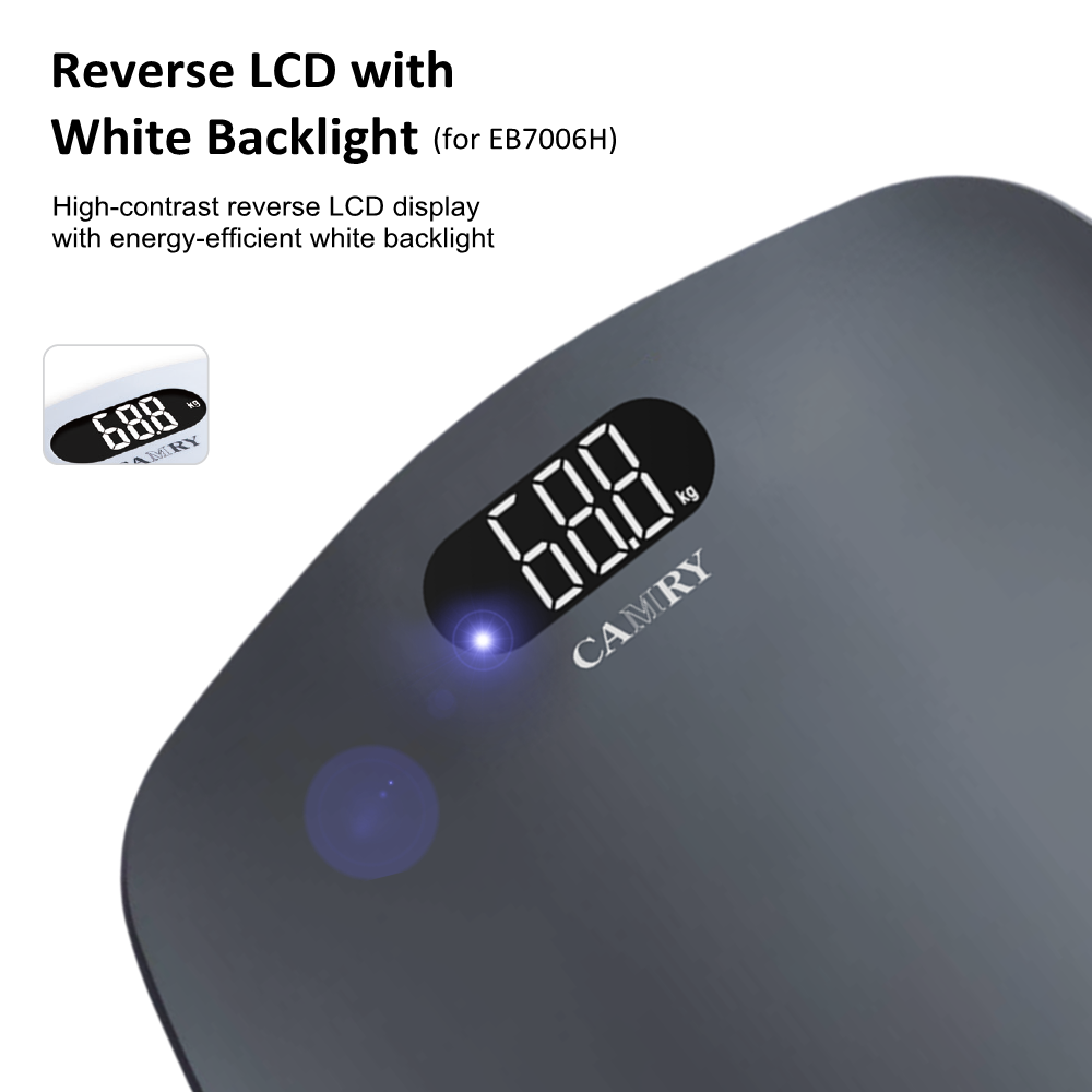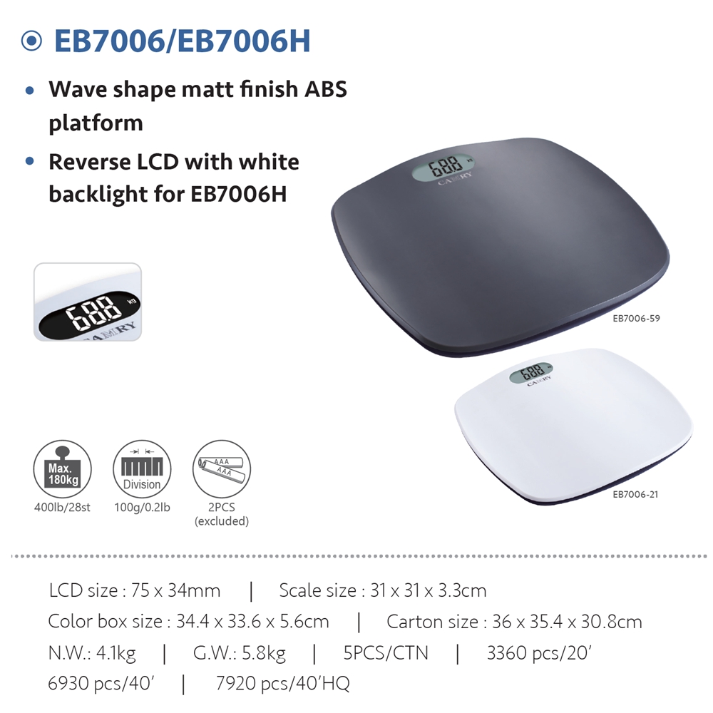 This weight scale has a large LCD display, large numbers make sure you can read the measurement clearly. The one with reverse LCD white backlight is EB7006H. The one with no backlight is EB7006.