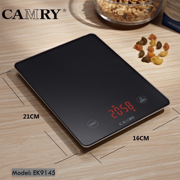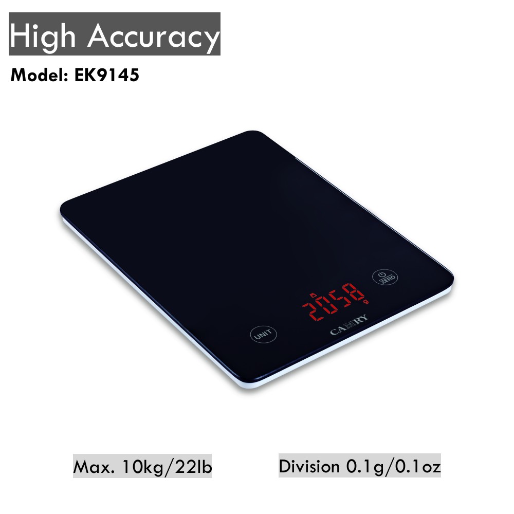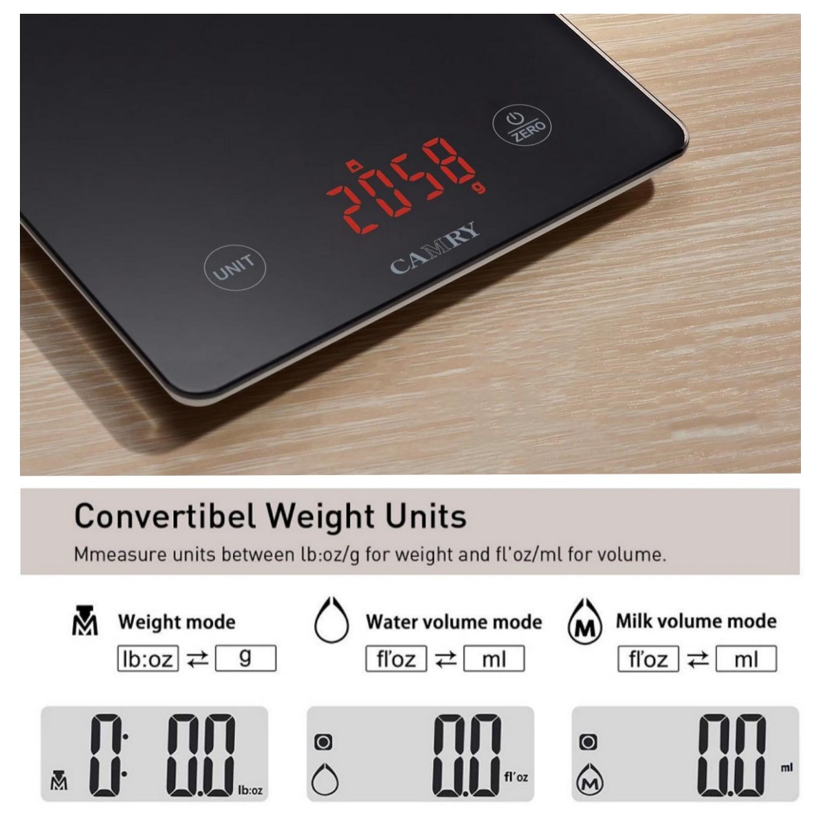 【Tempered Glass Kitchen Scale with Magic LED】This Camry Digital Kitchen Scale is built with 3mm tempered glass and 16mm night visible magic LED Display. With the touch button it provides more simple operations for your weighings: easy tare, easy units conversion and easy on and off.