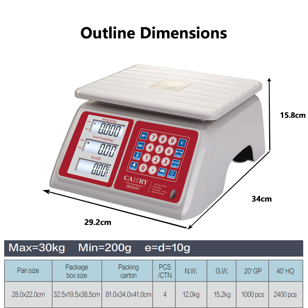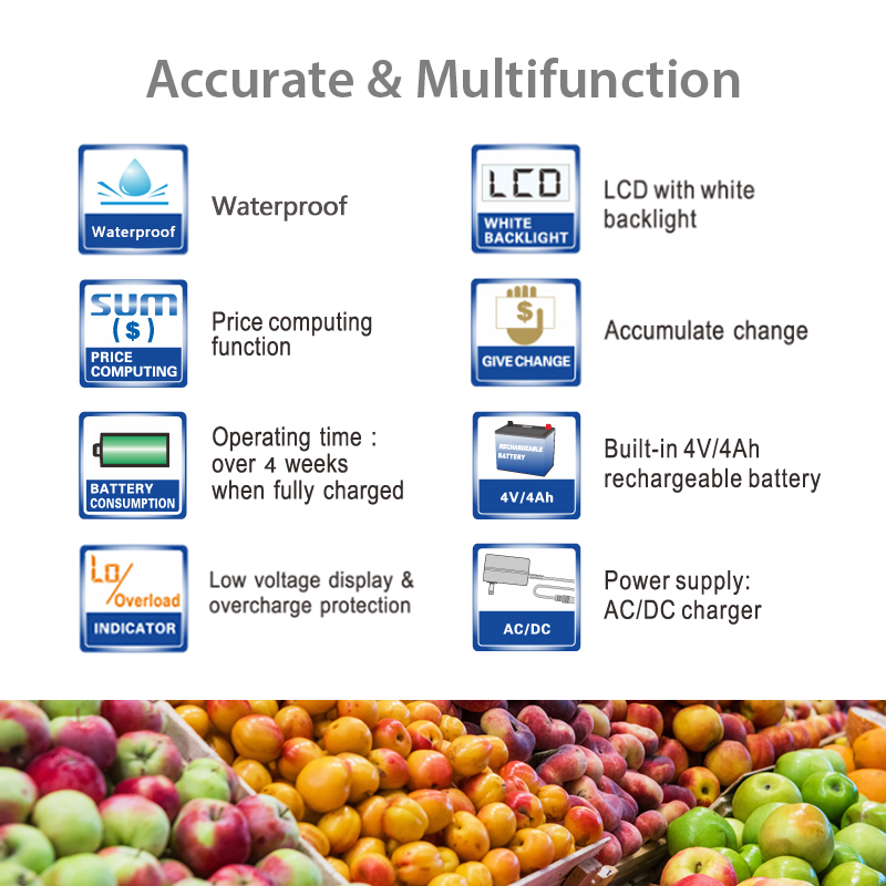 Waterproof,multifunctional with white backlight LCD,price computing,long battery,AC/DC power,ideal for retail weighing.