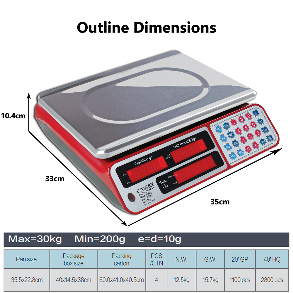 30kg max,33x35x10.4cm,10g resolution,ideal for commercial weighing with efficient packaging.