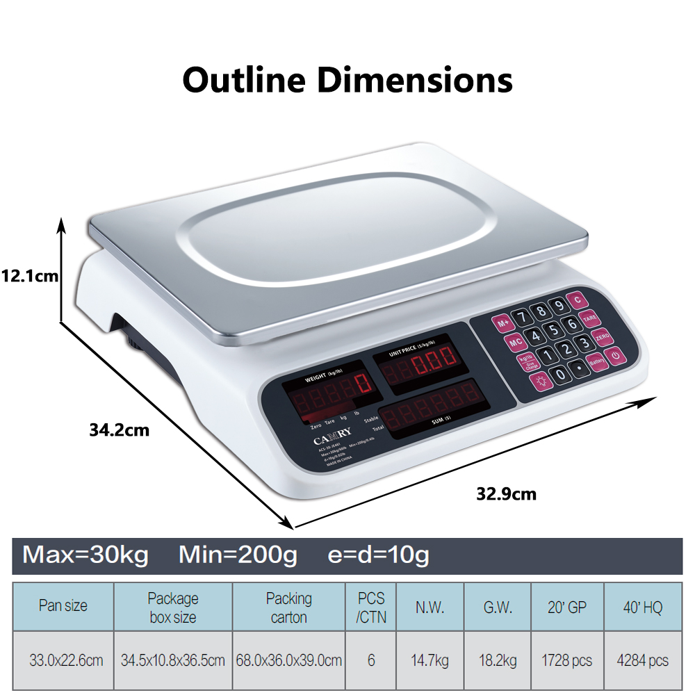 30kg max,33x35x10.4cm,10g resolution,ideal for commercial weighing with efficient packaging.